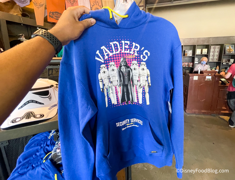 And finally, we have this blue Vader’s Security Services hoodie. It has a picture of Darth Vader flanked by Stormtroopers and is $59.99.