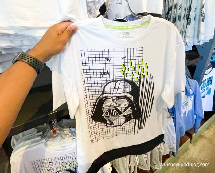 Speaking of white shirts, we also spotted this Darth Vader shirt that has Darth Vader’s helmet and TIE Fighters all set on a grid. This shirt is also $36.99.