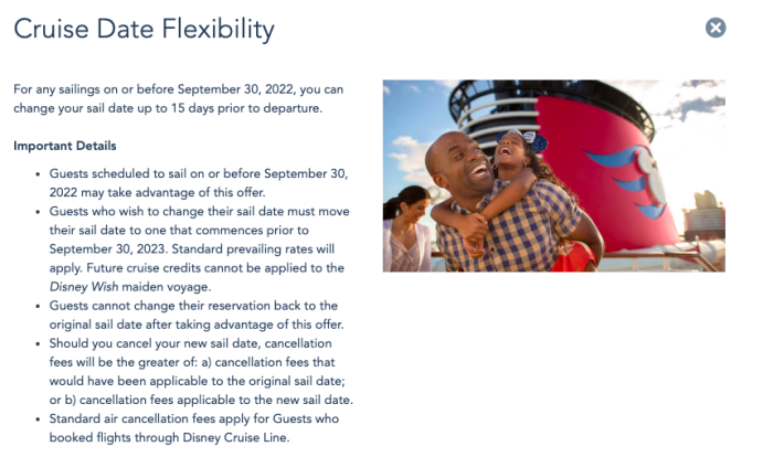 Disney Cruise Line has updated their flexibility, cancelation, and payment policies. Now, for all cruises sailing on or before September 30th, 2022, guests can change their sail date for their Disney cruise up to 15 days prior to the ship’s departure. Guests can change their cruise to any date before September 30th, 2023.