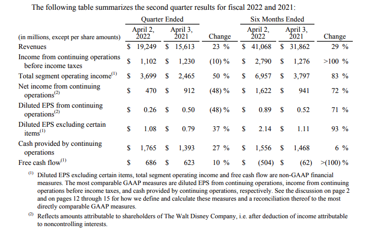 Overall, Disney has shared that revenues for this past quarter (Q2 of FY 2022) and six months grew 23% and 29% respectively, despite a reduction of $1.0 billion for certain amounts due to the end of certain license agreements and other matters.