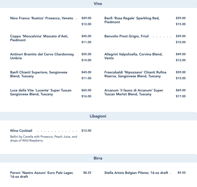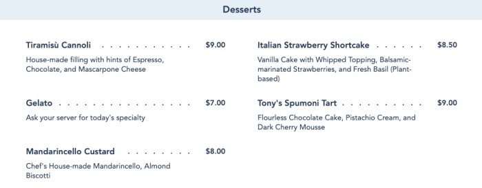 - You want really upscale Italian food. Even with these new menu additions, they might not be what you’d consider “upscale” Italian food. You might want to try Via Napoli in EPCOT if that’s what you’re looking for. These dishes are basic and the restaurant has proved to be very hit or miss.
