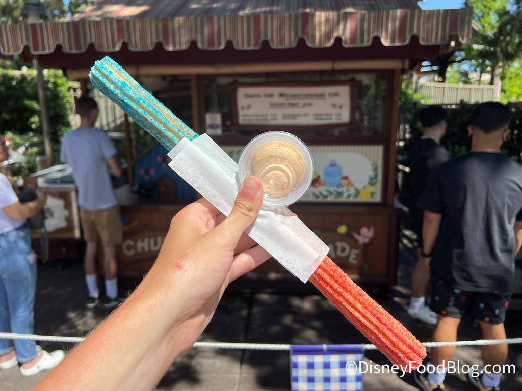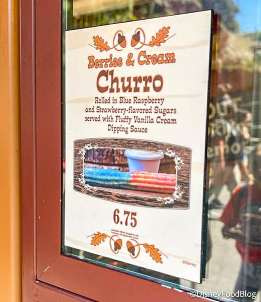 Disneyland now has a…Berries and Cream Churro? Yep, you read that right! And you’re welcome for getting that popular Berries and Cream song stuck in your head again! This sweet snack is rolled in blue raspberry and strawberry-flavored sugars and served with a fluffy vanilla cream dipping sauce for $6.75.