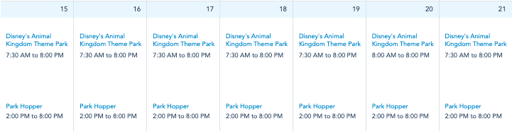 Finally, let’s take a peek at the hours for Disney’s Animal Kingdom.