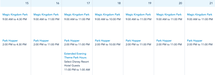 Magic Kingdom will be open from 9AM until 11PM on May 16th-17th, and May 19th-21st. The park will only be open until 10PM on May 18th, and there will be Extended Evening Hours for guests staying at Deluxe Disney World Resorts on May 17th, until 1AM.