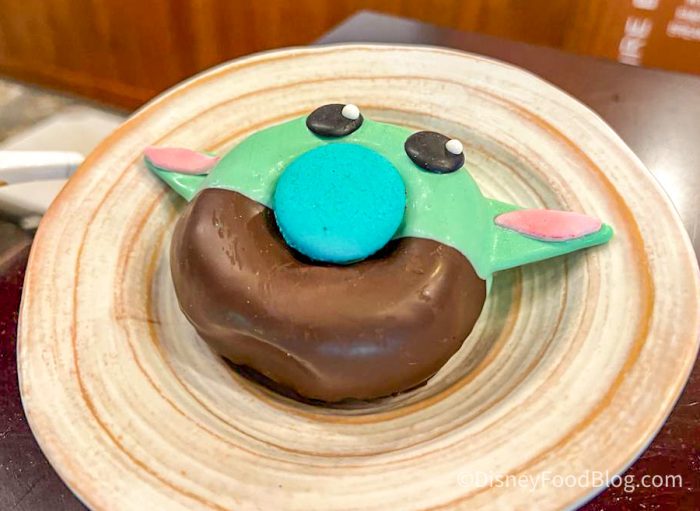 The Grogu donut has green and brown frosting, with the baby’s iconic giant ears and eyes. He even has a blue macaron that looks like the treat that he eats in The Mandalorian.