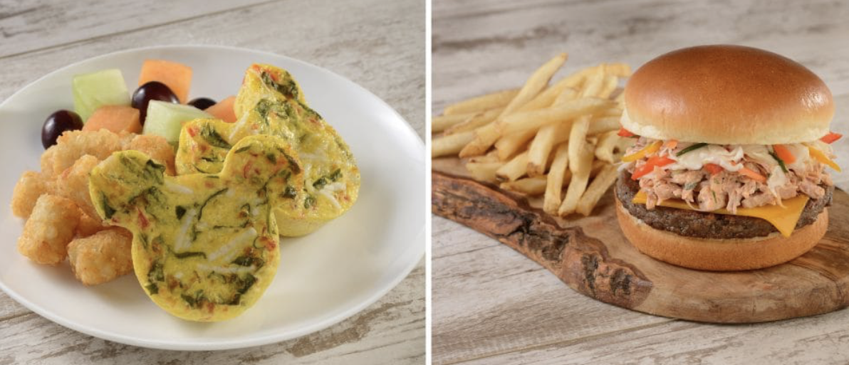 - Plant-based Mickey-shaped Frittata: tomato, spinach, onions, and “mozzarella” served with potatoes and mixed fruit (NEW)
