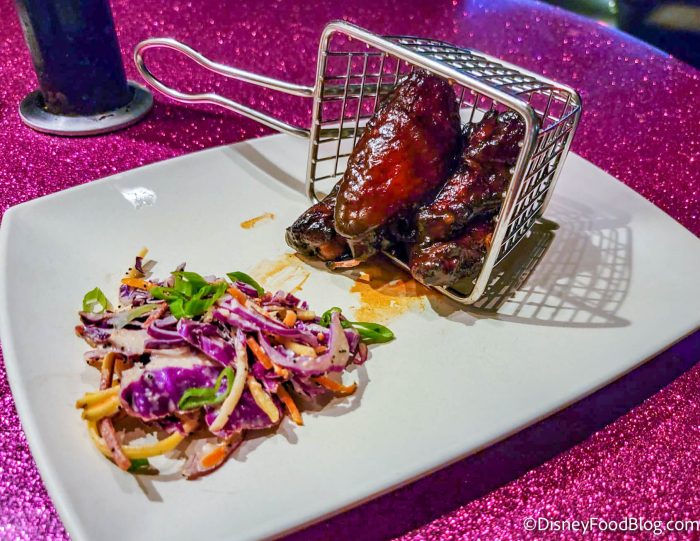 - ManGLOW (Mango) Barbeque Chicken and Waffles: Mango barbecue chicken wings and rainbow mickey waffles with purple cabbage slaw, mango chutney, and Sriracha honey butter