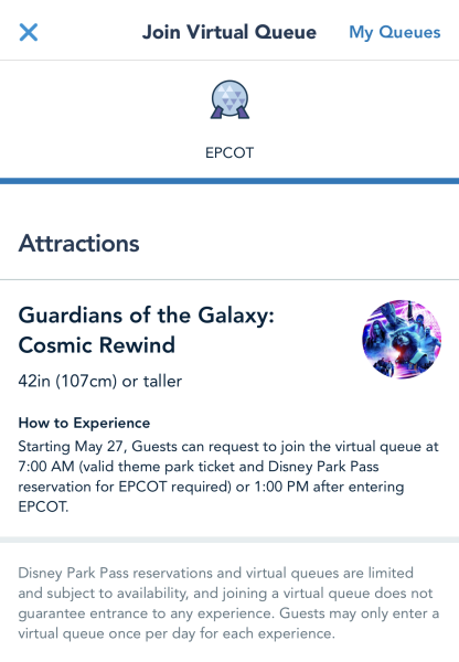 If you select “Join Virtual Queue” from that first screen, you’ll then get taken to another screen showing the virtual queue information for Guardians of the Galaxy: Cosmic Rewind in EPCOT. It notes that guests will be able to join the virtual queue at 7AM or 1PM (remember there is a third time to join for select guests eligible for the Extended Evening Hours perk in EPCOT on nights when that is offered).