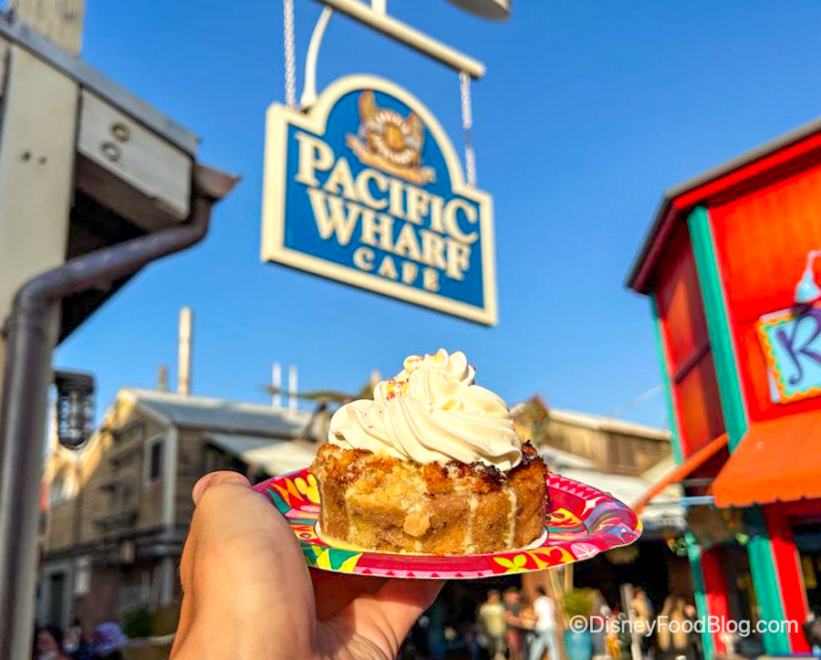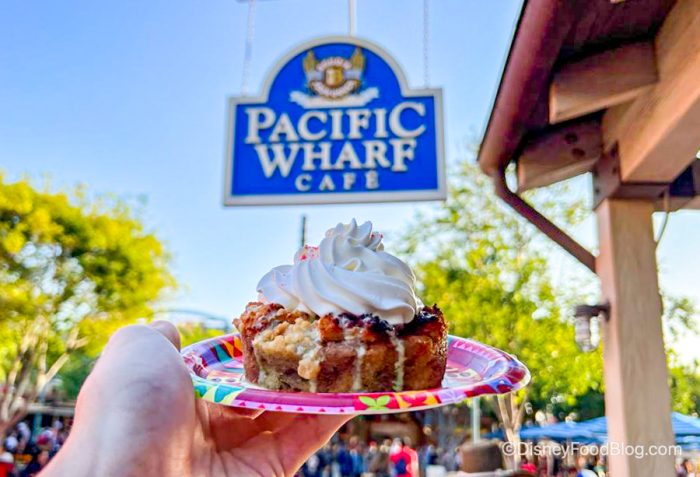 We took a trip to Disneyland Resort to see if there was anything new for us to check out! While we were strolling through Disney California Adventure we happened to see a brand-spankin’ new dessert at Pacific Wharf Cafe — the Strawberry Shortcake Bread Pudding!