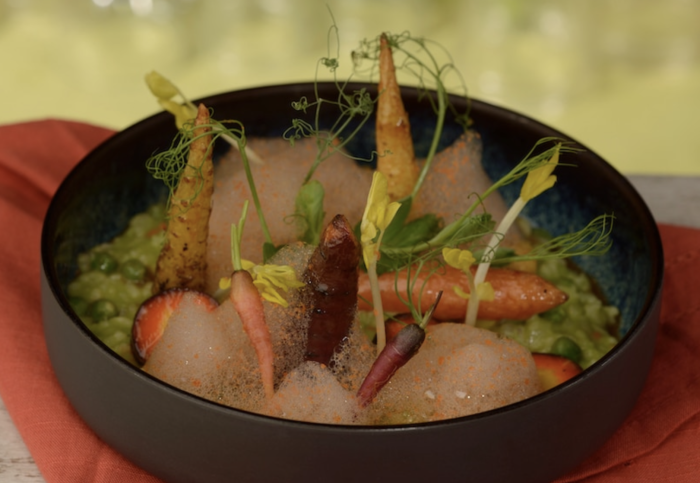 The other new plant-based entrée is the Peas and Carrots Risotto with heirloom carrots, English peas, green garlic, confit onion, and sweet carrot foam. Chef Matthew Birch crafted the dish to look like everything is sprouting up from the ground!