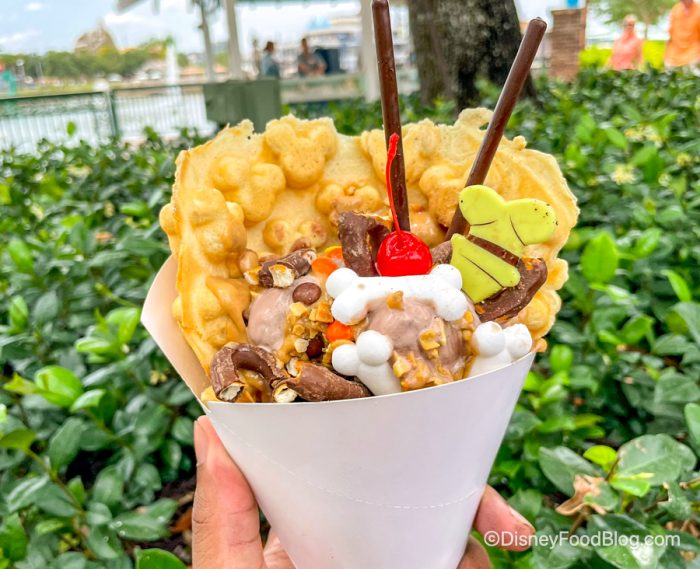 We tried the Mickey Cookie Waffle Sundae — it’s made with vanilla soft-serve, hot fudge, cookie crumbles, and white chocolate chip pearls in a Mickey bubble waffle for $8.99.