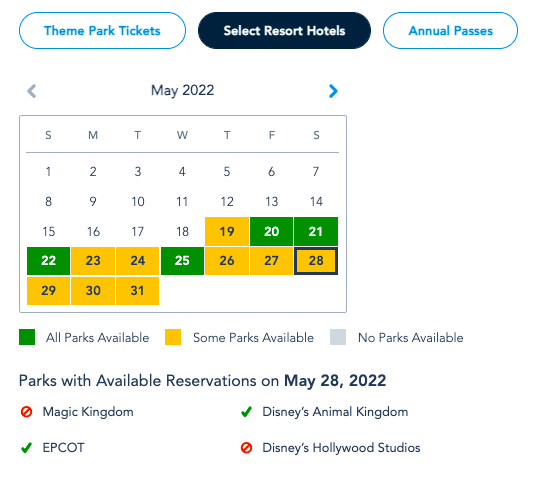 Theme park ticket holders can make reservations at Magic Kingdom on May 22nd, 25th, and 26th. Disney’s Hollywood Studios is available on May 22nd, 23rd, 24th, and 25th, EPCOT is available on the 22nd, 23rd, 24th, 25th, 26th and 28th, and Animal Kingdom is available every day!