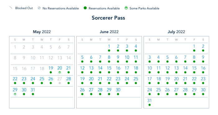 Sorcerer Pass holders can also make a reservation at any of the four parks every day next week except for May 27th, which is sold out.
