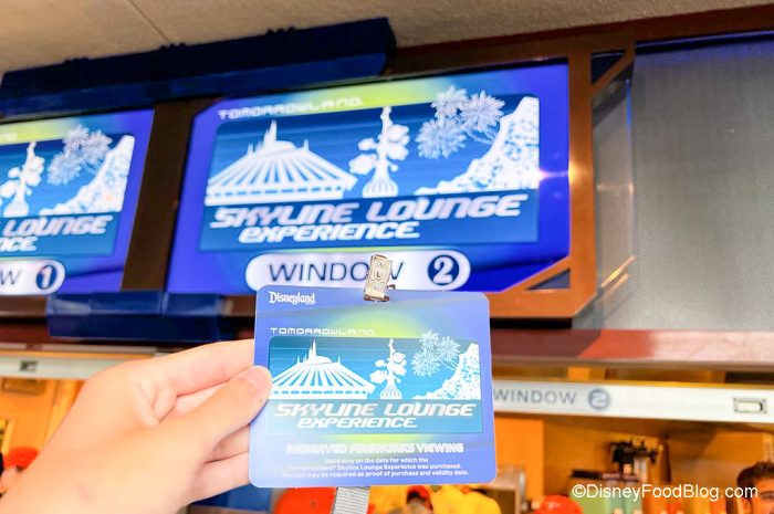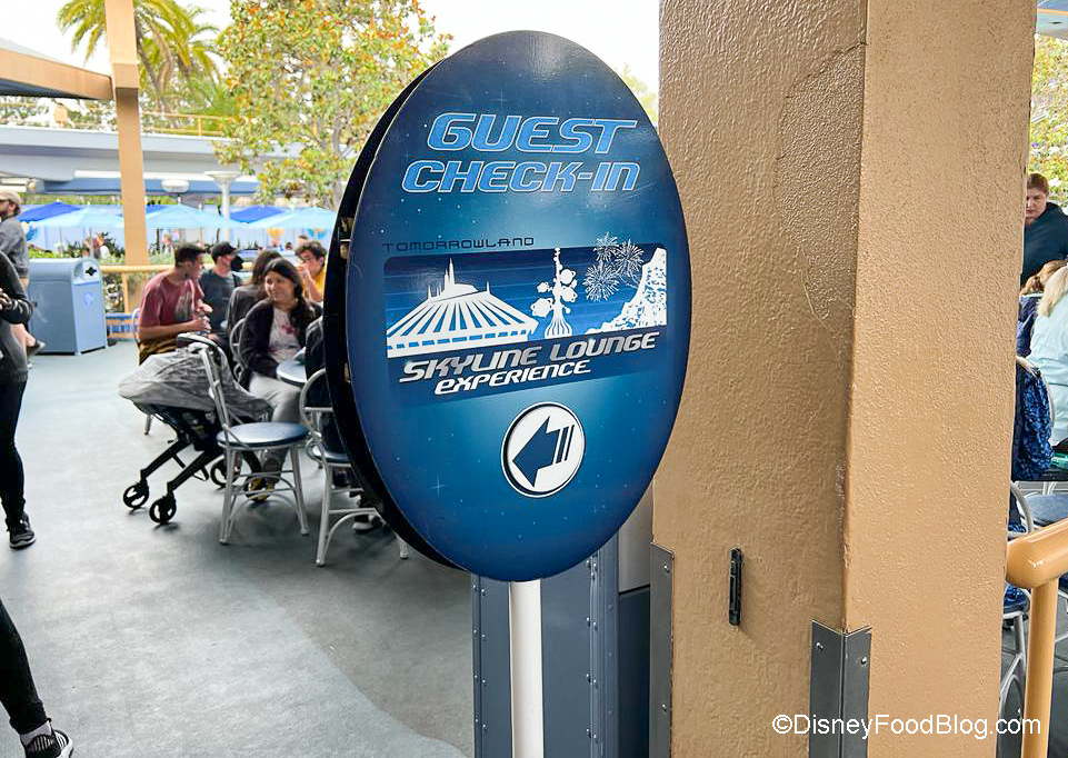 To check in for the Tomorrowland Skyline Lounge at your reservation time, you can either go to Window 1 at Galactic Grill or to the Tomorrowland Skyline Podium near the entrance of Alien Pizza Planet. You’ll see signs at both locations indicating where you need to go.