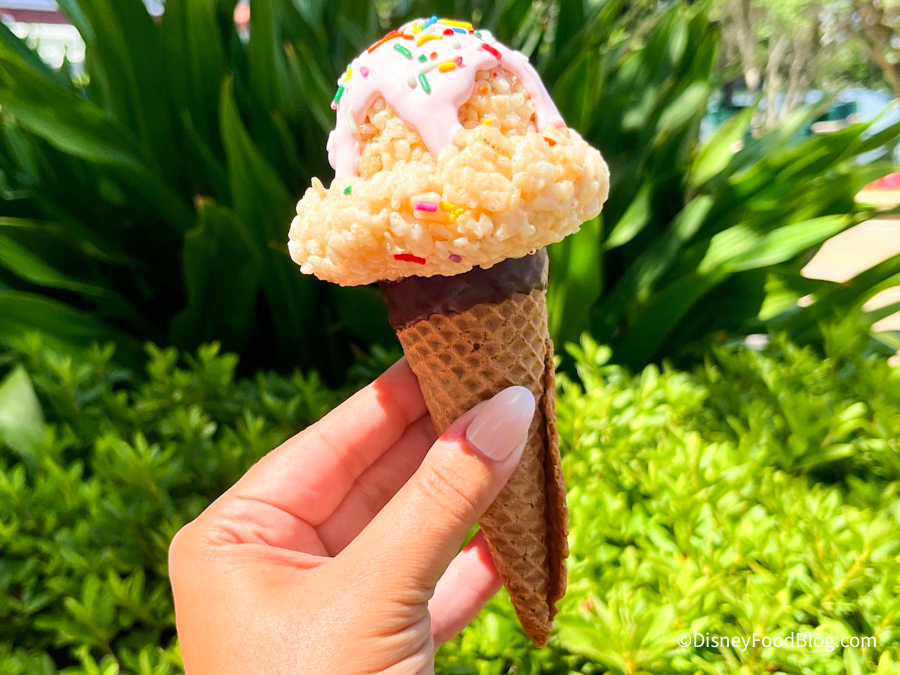 The Grand Floridian is home to the Gasparilla Island Grill, which is where we grabbed the new Dreamsicle Cone! This dessert is a waffle cone with a brownie inside (!!!) and a rice krispy treat shaped like a scoop of ice cream on top. And if that wasn’t enough, there’s even some white chocolate drizzle on top of the rice krispy treat!