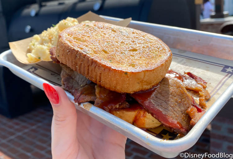 Hearty, meaty, carb-loaded, and savory — all words that we would use to describe Sliced Texas Beef Brisket Sandwich from Regal Eagle Smokehouse in the American Adventure.