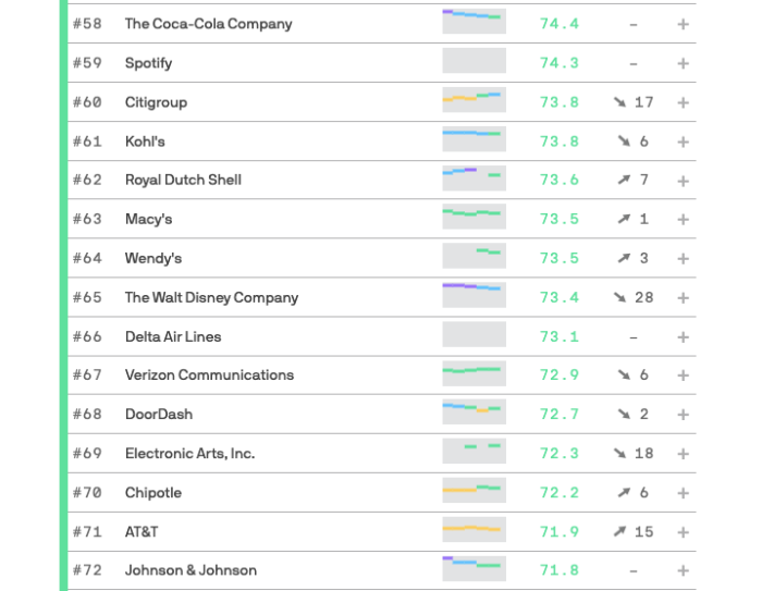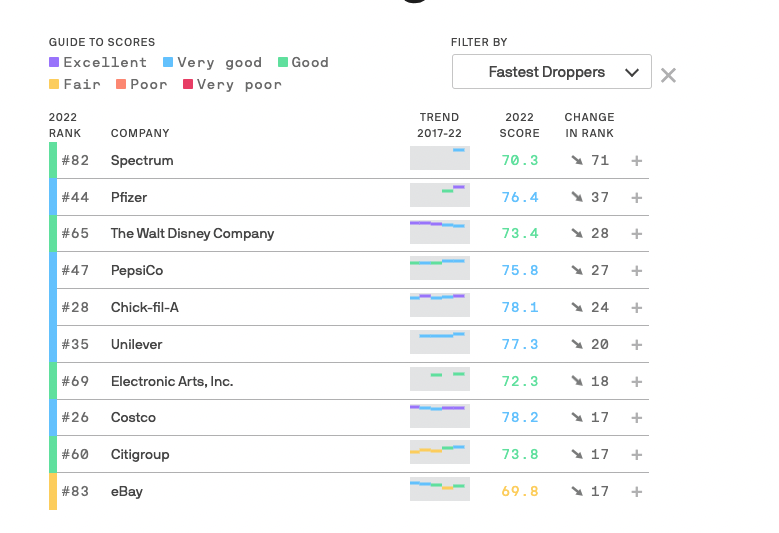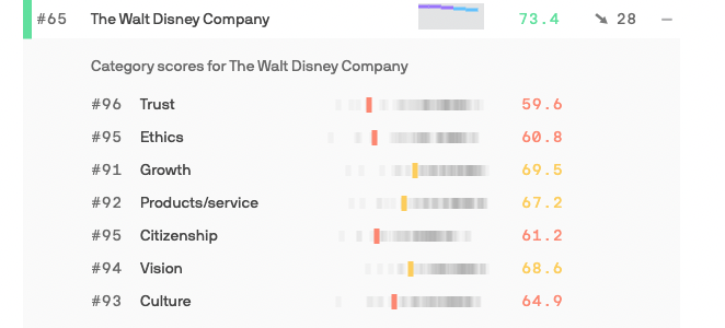 So what about The Walt Disney Company? For the 2022 poll, Disney had a score of 73.4 and ranked 65th on the list. This is actually a DROP of 28 spots compared to its position last year.