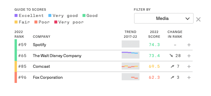 Compared to other companies in the Media category, Disney was below Spotify in rankings, but above Comcast and the Fox Corporation.