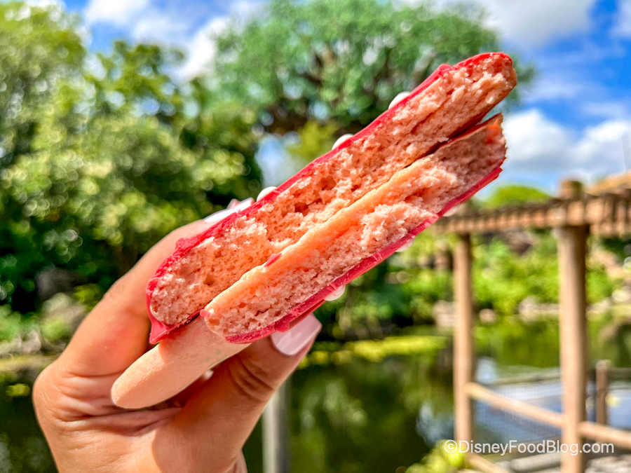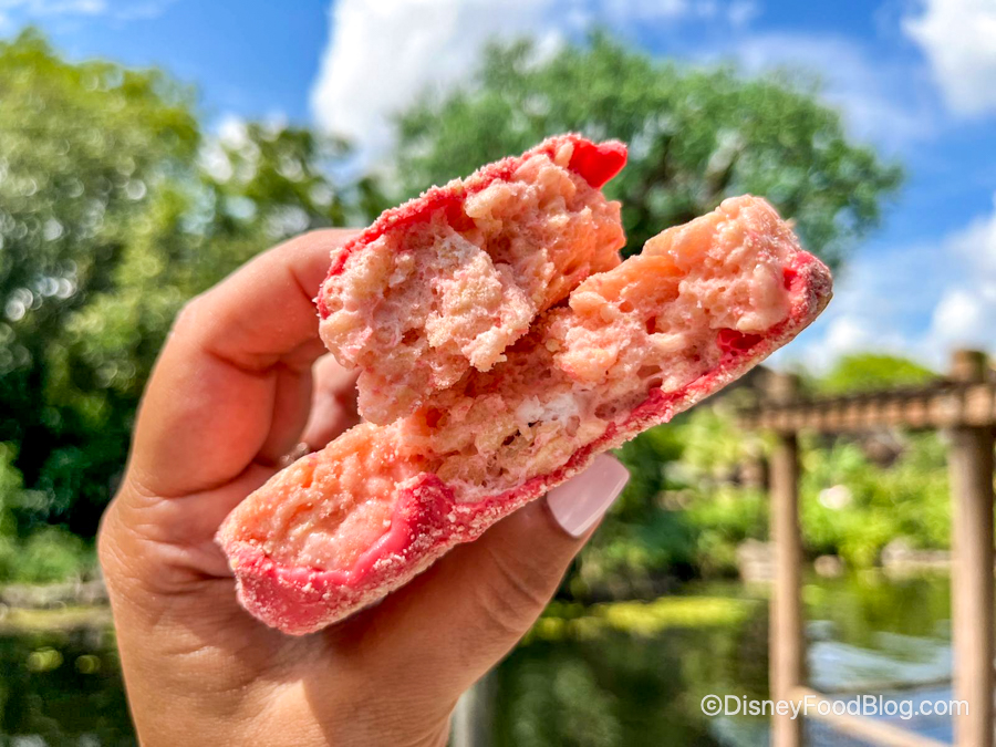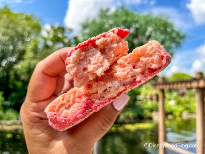 This sort of reminded us of those strawberry shortcake ice cream bars you could get at school or from the ice cream truck! It was nice and fresh (unlike most rice cereal treats at Disney) and the coating on the outside lent a nice texture and added strawberry flavor.