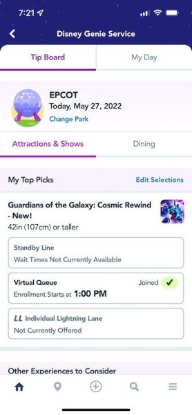 Guardians of the Galaxy: Cosmic Rewind is using the virtual queue system, which means that EPCOT guests typically have 2 chances daily to join the queue using the My Disney Experience app — the first at 7AM and the second at 1PM. There is one BONUS opportunity for those who are eligible for Extended Evening Hours on select nights at 6PM as well.