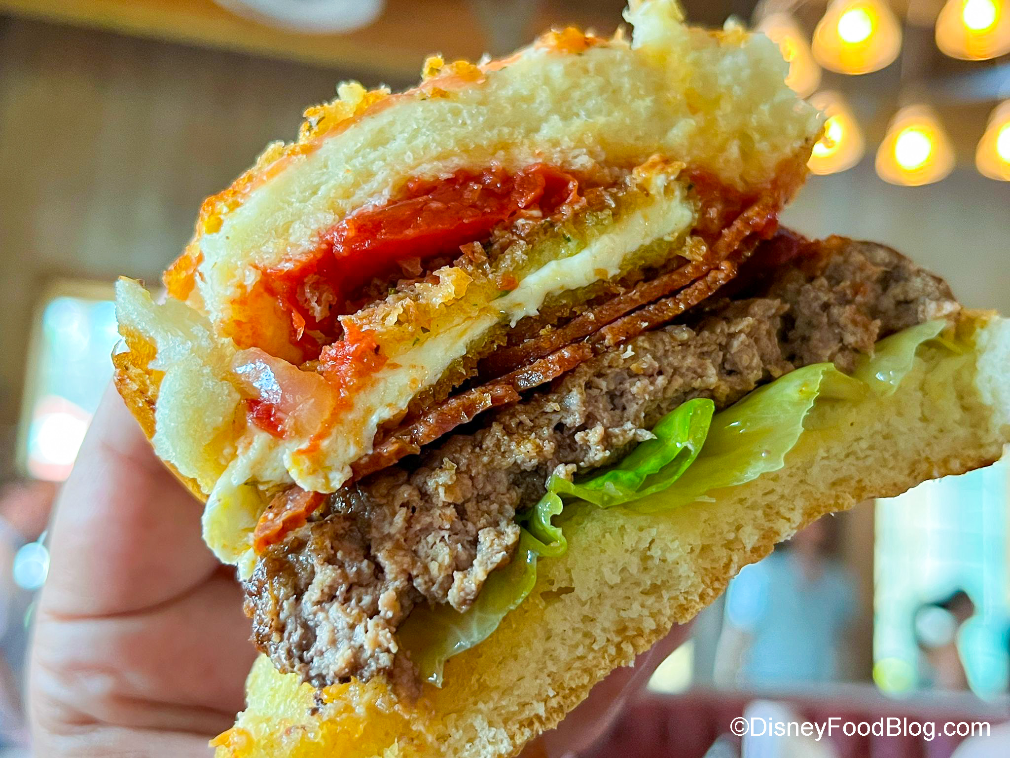 It has two-pressed signature blend patties topped with pepperoni, fried mozzarella, lettuce, and tomato sauce on a Parmesan-tomato herb bun 🍔#mediaevent #disneysprings @DisneySprings pic.twitter.com/c88u7iP8HH