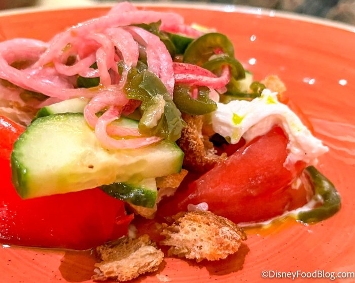 The Toy Box Tomato Salad from Tony’s Town Square Restaurant is a newer menu item, and for $12 you get marinated tomatoes with torn burrata cheese, cucumbers, focaccia, pickled onions, and basil. And like the barbecue chicken sandwich, it was just okay. Although the vegetables were fresh, we thought the burrata cheese needed more salt.