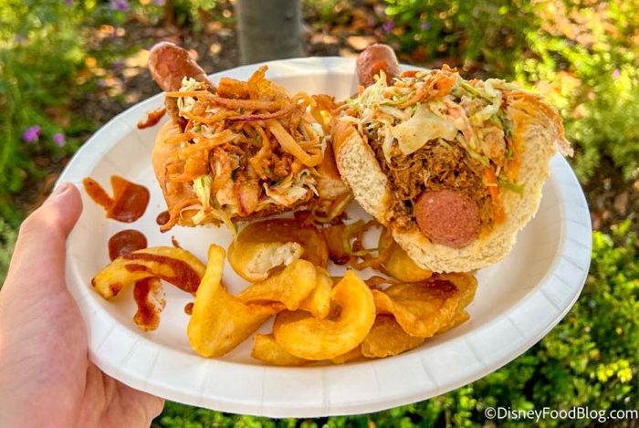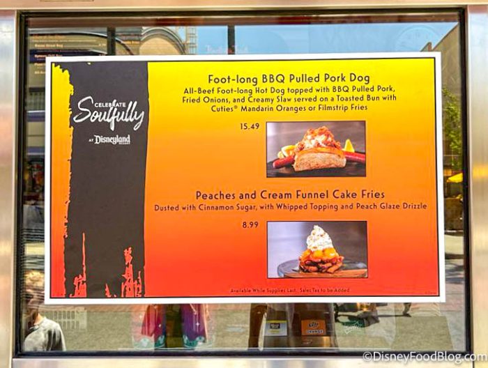 For the Celebrate Soulfully event at Disneyland Resort, Award Wieners in Disney California Adventure added two new menu items, including the Foot-long BBQ Pulled Pork Dog and the Peaches and Cream Funnel Cake Fries. These new eats will be available from June 1st through September 2nd.