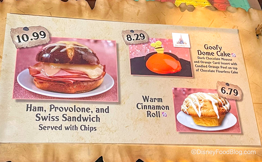 Gaston’s Tavern is a popular spot for many guests to grab a snack in Magic Kingdom — we especially love their giant WARM Cinnamon Roll (pro-tip: order a side of extra icing, you can thank us later!). We stopped by recently to see if there was anything new on the menu, and we lucked out — the Goofy Dome Cake is now being served at this Fantasyland spot.