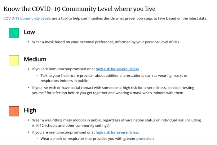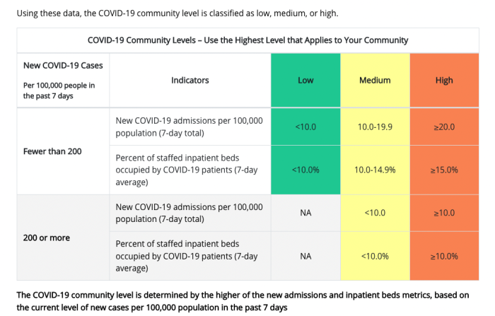 Depending on what the numbers add up to, a community may be classified in the “low,” “medium,” or “high” level. Different mask recommendations and other advice applies depending on the community level a particular county is in.