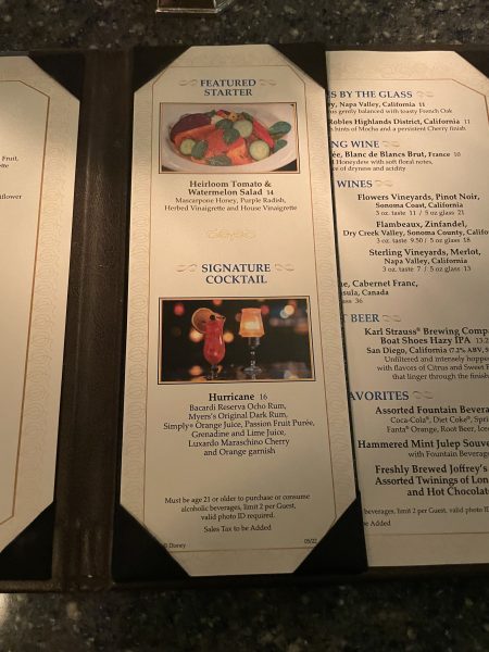 Plus, if you’re visiting now, you’ll also be able to find the Heirloom Tomato & Watermelon Salad (which is made with Mascarpone Honey, Purple Radish, Herbed Vinaigrette and House Vinaigrette for $14) on the menu as a Featured Starter, along with a signature cocktail, the Hurricane. It is made with Bacardi Reserva Ocho Rum, Myers’s Original Dark Rum, Simply Orange Juice Passion Fruit Puree, Grenadine and Lime Juice, Luxardo Maraschino Cherry and Orange garnish and costs $16. We’ve tried this drink before!