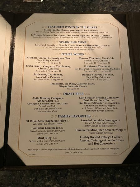 The main menu has remained mostly the same since we last stopped by to eat here. The only newer addition is the Hearts of Palm Escabeche under the “Introductions” (a.k.a. appetizer) section and the dessert selections are a bit more limited. Entree-wise, there aren’t any notable changes and you can still find things like the Chicken Gumbo and the famous Disneyland Monte Cristo.