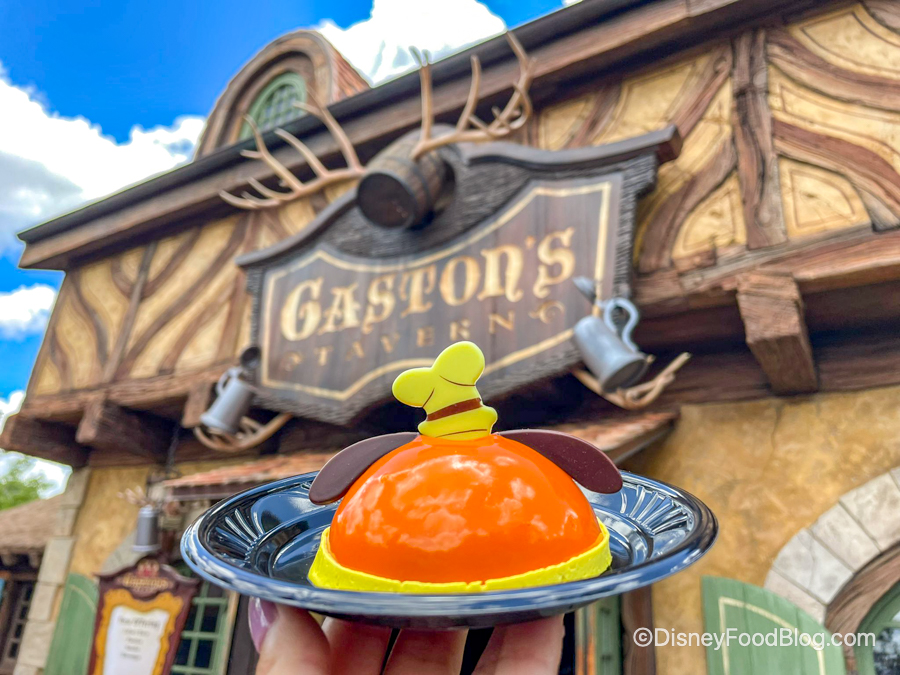 Let’s start things out with some new snacks! First up, we got the Goofy Dome Cake at Gaston’s Tavern a few days ago. This new treat is made with dark chocolate mousse with orange curd and candied orange peel on top of chocolate flourless cake. You can grab it for $8.29, but fair warning — this treat is VERY rich!