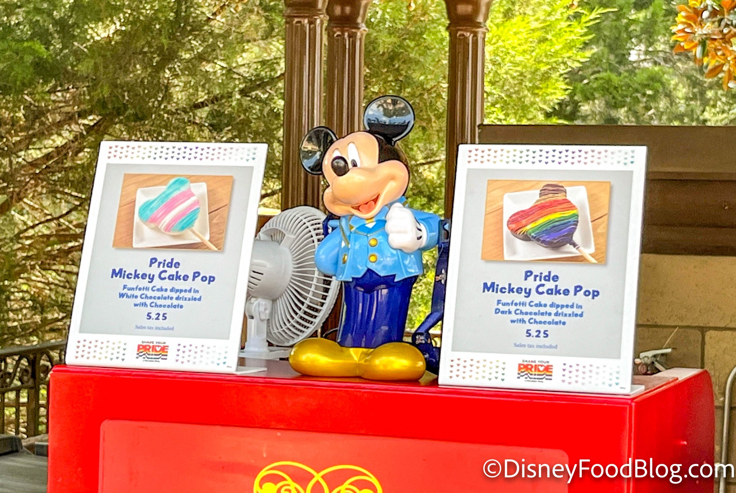 Across the castle hub, you’ll find one of Magic Kingdom’s busiest popcorn carts. There, guests can order two new treats — the Pride Cake Pops.