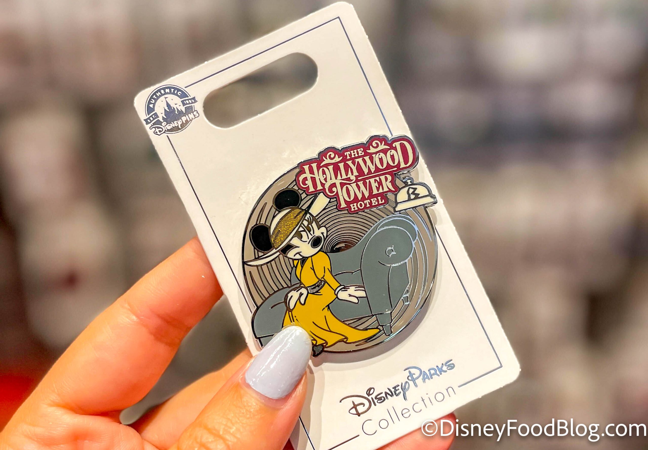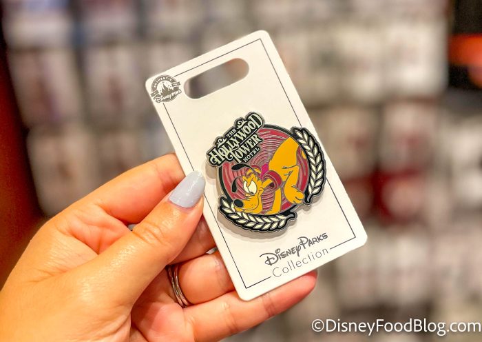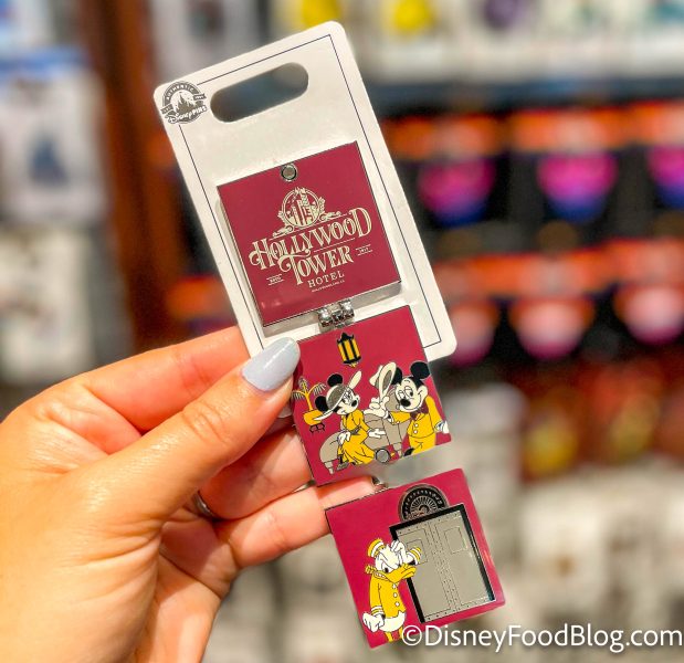 Oddly enough, we spotted some Tower of Terror merchandise in Magic Kingdom this week. Four new Hollywood Tower Hotel pins arrived, each themed to different classic Disney characters. First up, we’ve got the Mickey Mouse pin that folds for $17.99.
