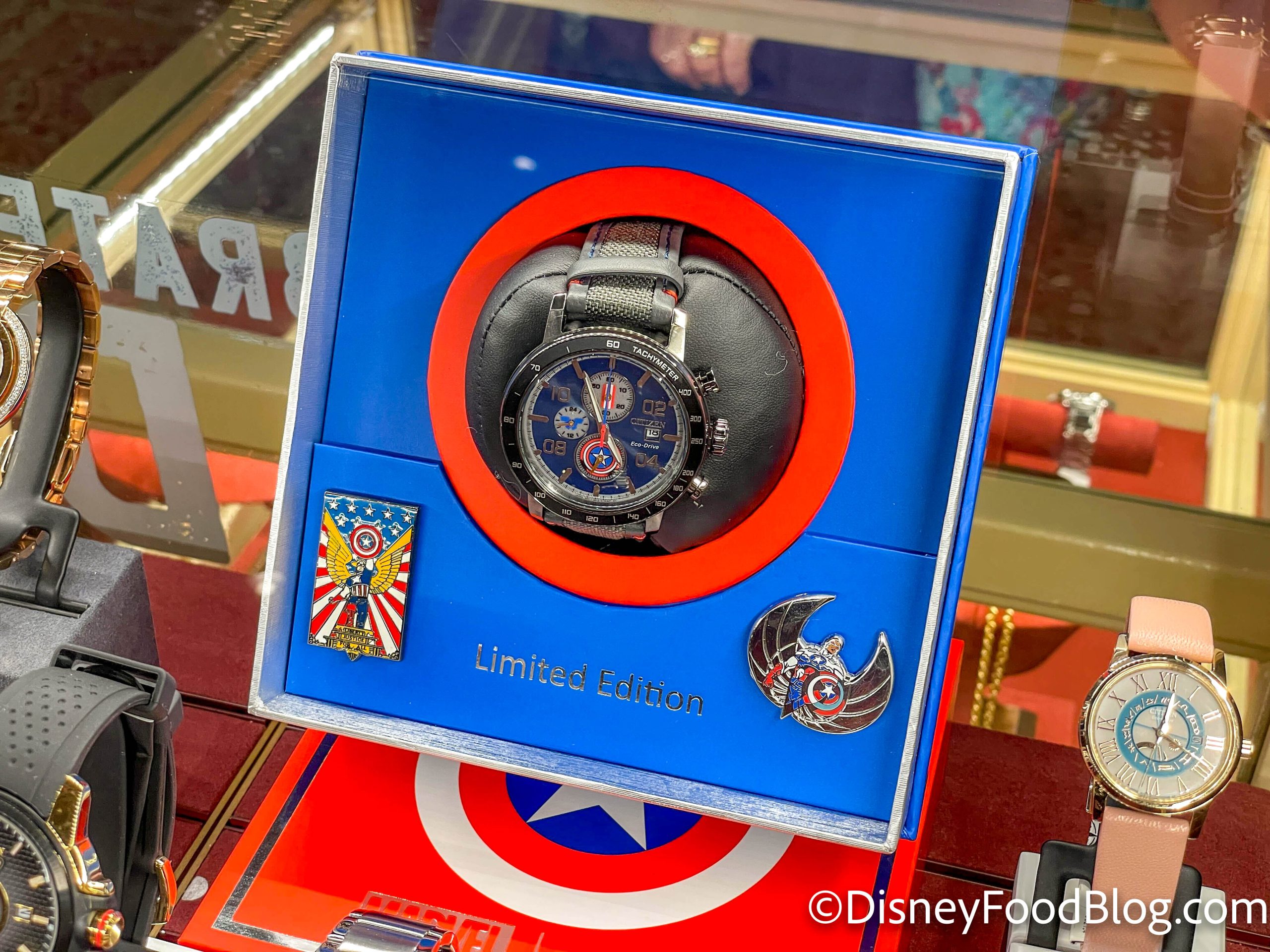 Back to Main Street, Uptown Jewelers has some new (and very pricey) merchandise! The Citizen Captain American Watch and Pin Set that we spotted is a whopping $450.