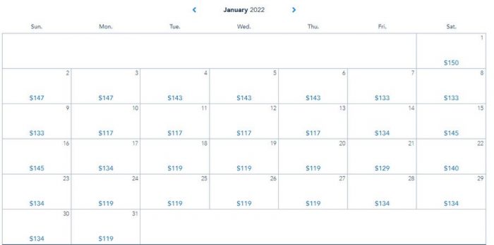 In January of 2022, we saw Friday through Sunday prices range between $133-$145 for the most part, except for on New Year’s Day, which was at $150. Weekdays ranged between $117-$143, with 1 day being at $147.
