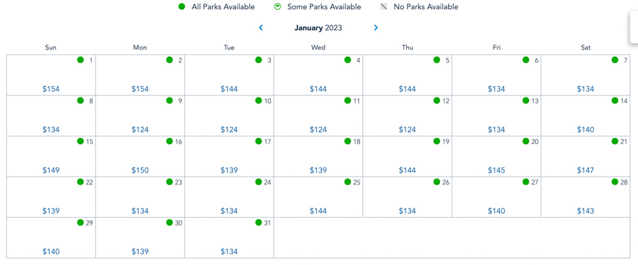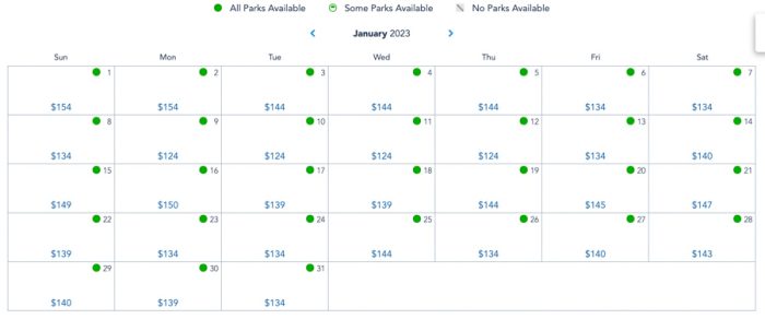 In January of 2023, Fridays through Sundays range between $134-$149, with New Year’s Day being at $154. Weekdays range between $134-$144, with 1 day being at $154.