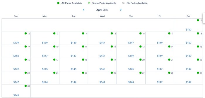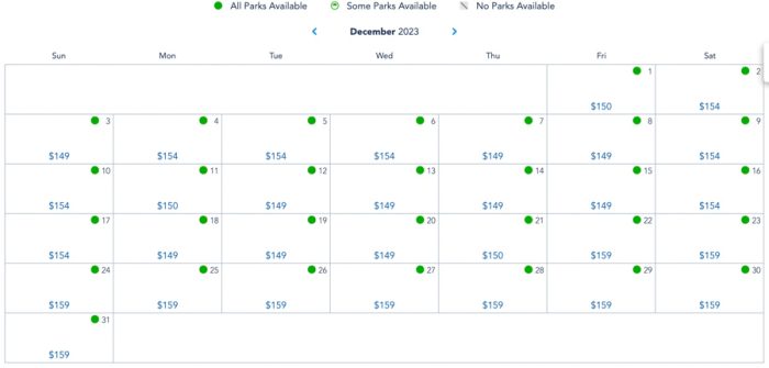 In December of 2023, we see a slight change. Fridays through Sundays range from $149-$159 still, but the weekdays leading up to the week of Christmas have increased, now being between the range of $149-$154. The week of Christmas is still at $159 through New Year’s Eve.