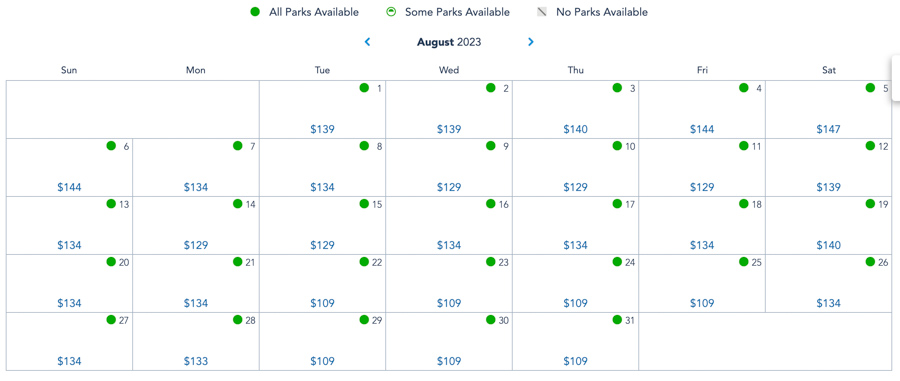 In August of 2023, prices pretty much stay the same. In fact, the range actually starts out lower than it does in 2022 and is just a little bit higher on a few other days. Friday through Sunday prices range from $109-$147, and weekday prices range from $109-$140.