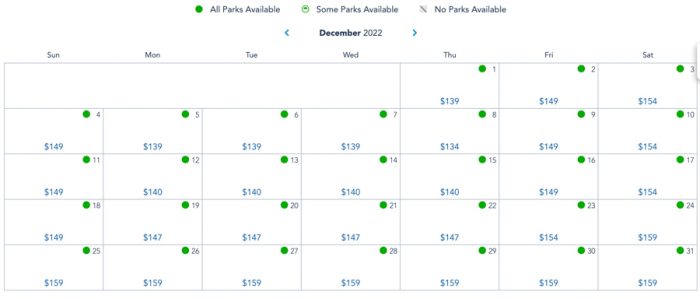 In December of 2022, Friday through Sunday prices range from $149-$159. Weekday prices are between $139-$147 up until before the week of Christmas. Then, during the week of Christmas, every day is at $159 through New Year’s Eve.