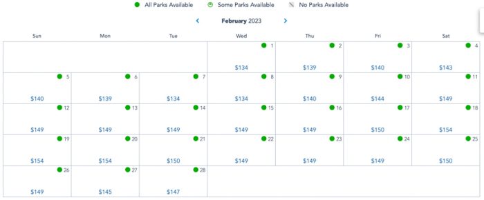 In February of 2022, toward the end of the month, we saw Fridays through Sundays range from $139-$149, and weekdays be around $134 per day.