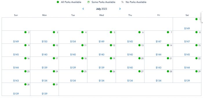But, in July of 2023, Friday through Sunday prices range from $134-$149, and weekday prices range from $134-$150, with 4th of July being at $154 (the most expensive day of the month!).