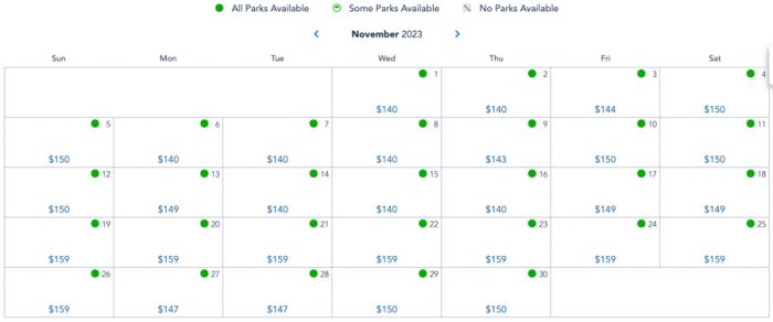 In October of 2023, Friday through Sunday prices are between $144-$154 again. Other weekday prices are between $140-$145, with one day at $154. Halloween in 2023 is at $143.