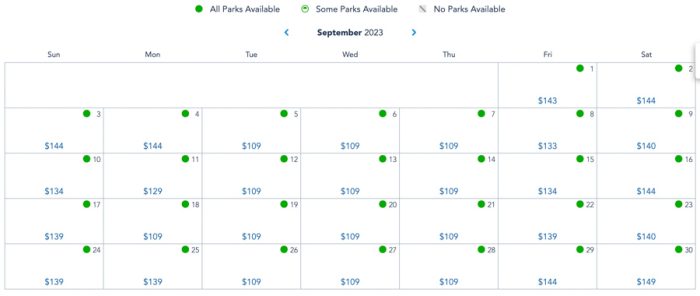 Then, in September of 2023, Friday through Sunday prices range from $134-$149 and weekday prices are consistently at $109, with 1 day at $129 and another day at $144.