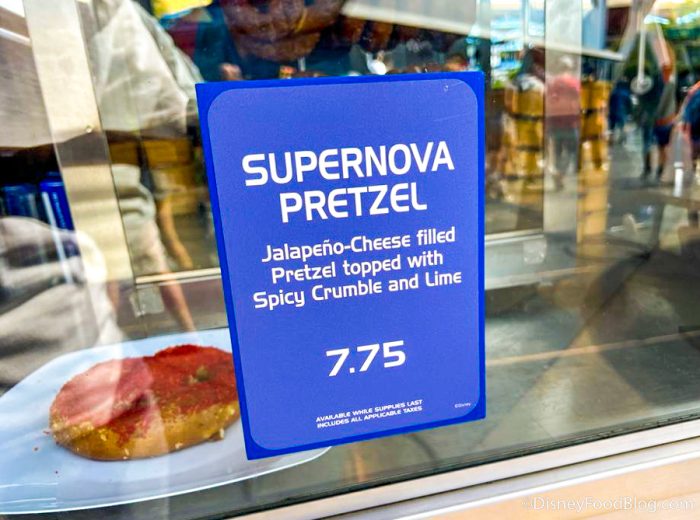 Check out the Supernova Pretzel! We found it over at the Tomorrowland Pretzel Cart in Disneyland Park. It’s a Jalapeño-Cheese filled Pretzel topped with Spicy Crumble and Lime for $7.75.