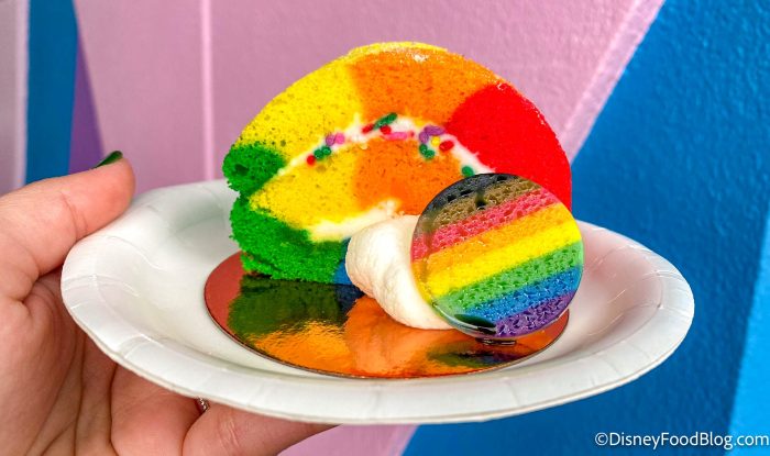 First, we’re heading over to Art of Animation where we tried the new Rainbow of Pride treat. The Rainbow of Pride is a vanilla cake roll with lemon cream cheese filling and white chocolate decoration!