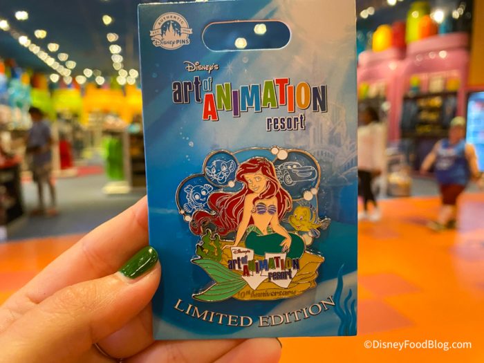 Keeping with the Little Mermaid theme, we also saw this pin! It is a limited edition pin celebrating the 10th anniversary of the hotel! Can you believe Art of Animation has been open for 1o years already? The pin has Ariel front and center with drawings of Simba, Lightning McQueen, and Nemo in the background. It is $19.99.