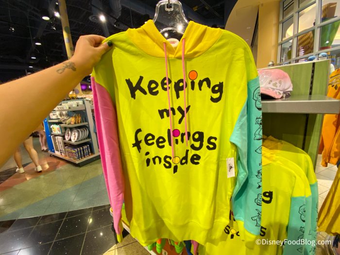 Heading across the water from Art of Animation to Pop Century, we found some new Inside Out clothing items! First up, was this Inside Out sweatshirt. It is brightly colored and says “Keeping my feelings inside” with characters from the movie down one sleeve. It is $59.99.