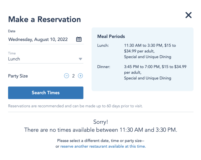 Something similar going on with Cape May Cafe. No available dates for dinner after July 31. I’ve got a resort reservation that goes from Aug 20-28, so can see just out to the 28th. Breakfast available but not dinner.