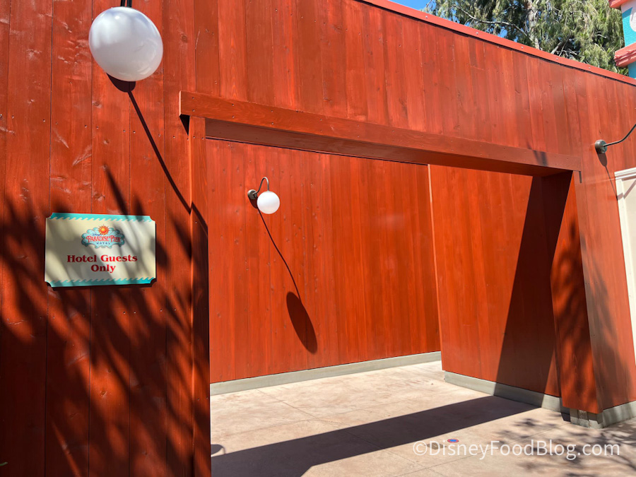 The park entrance is located next to the security/parking booth at the entrance of Disney’s Grand Californian Hotel.